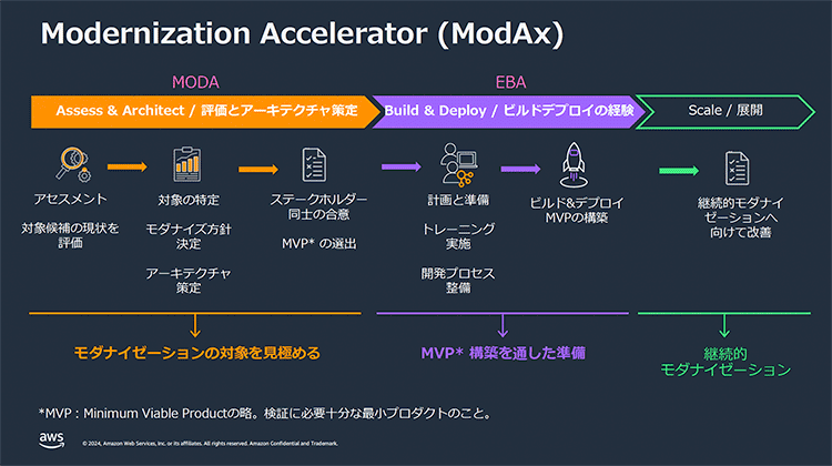 AWS が開発したモダナイゼーションの方法論 ModAx(Modernization Accelerator)は、システムの評価とアーキテクチャ策定を行ない、モダナイゼーション対象となるアプリケーションを見極め、実際にビルド&デプロイを経験していただくプログラムです。一方、モダナイゼーションの推進は専門的なスキルやエンジニアリソースの確保が必要となることから、AWS パートナーとして豊富な支援実績を持つアイレットが、モダナイゼーションの実現に向け各フェーズにおける支援を行なうこととなりました。