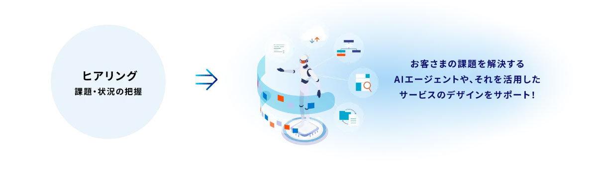 サービスデザイナーやPO(プロダクトオーナー)リードが企画立案フェーズからサポートし、お客様の課題解決に繋がるAIエージェントやサービスのデザインを支援します 。