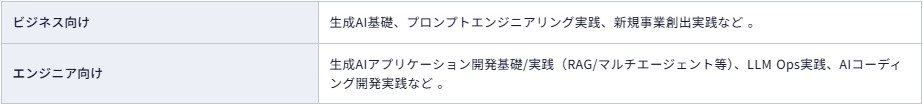 最新の生成AIトレンドを追従した様々なプログラムを、実際にAIを活用したサービス開発に携わるエンジニアや、知識豊富なエバンジェリストなどが提供します 。また、お客様の要望に応じて複数のコンテンツを組み合わせたカスタマイズや、生成AIアイデアソン、ハッカソンなどのご支援も可能です 。