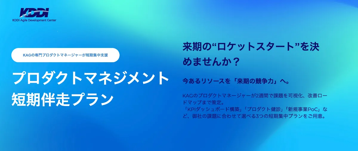 KDDIアジャイル開発センター株式会社(本社:東京都港区、代表取締役社長/CEO:木暮 圭一、以下 KAG)は、プロダクトの成長に必要な「意思決定」と「次の一手」を導くための短期間支援サービス「プロダクトマネジメント短期伴走プラン」(以下、本サービス)の提供を開始します。