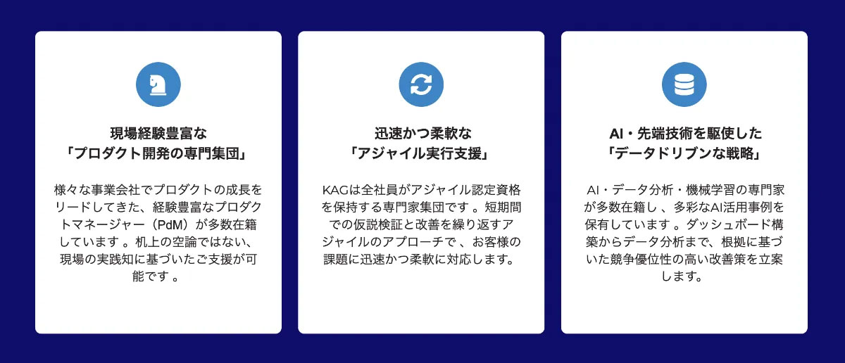 また、本プランはメガベンチャーや大手Web企業での事業責任者、PdM経験者など、実戦経験豊富なKAGのスペシャリストが担当します。 机上の空論ではない、現場の実践知に基づいたご支援が可能です 。