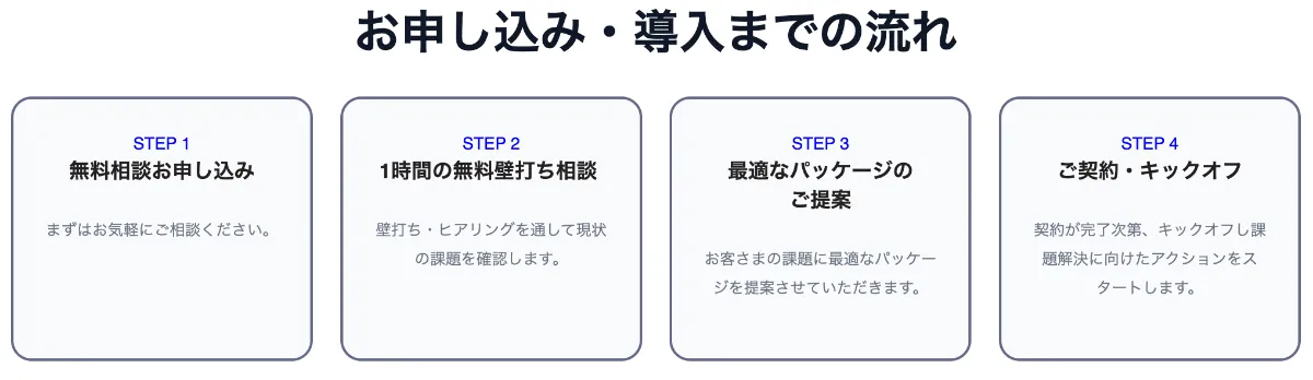 | 成果物イメージ | KPI定義(KPIツリー指標定義) 計測・データ定義(GA4等) ダッシュボード(Looker Studio等) 分析環境の初期整備(最小限) |