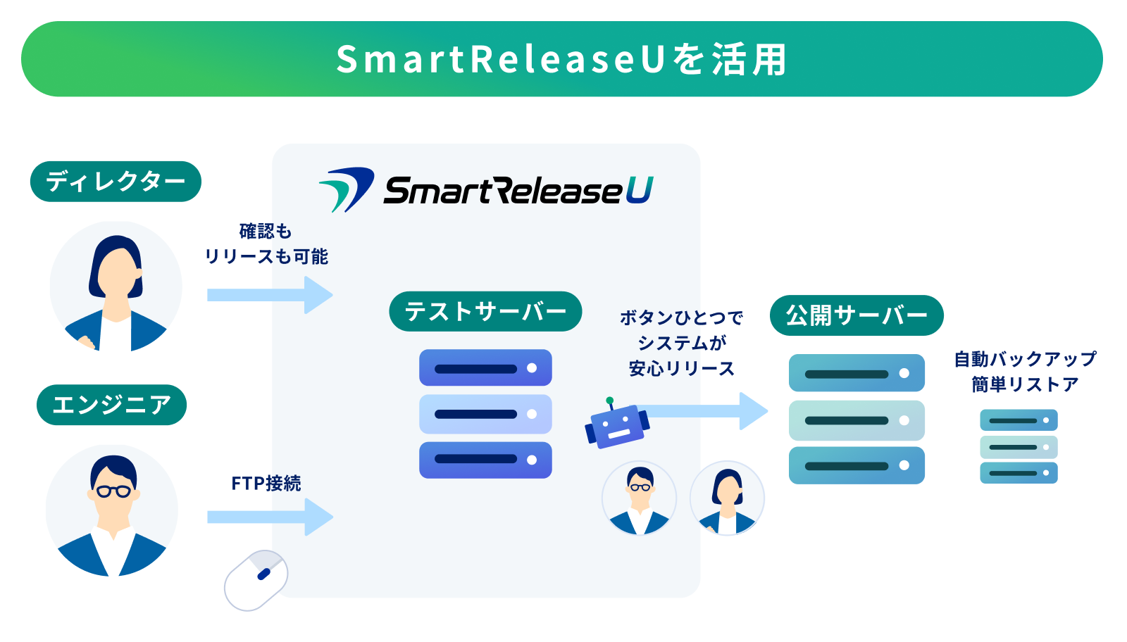 SmartRelease Uは、運用作業をシステムで自動化し、誰にとっても安全で簡単なWebサイト管理を実現する高機能テストサーバーサービスです。テストサイトで作成したコンテンツをクリック操作だけで公開サイトにリリースでき、従来のようなFTPで公開サーバーにファイルをアップロードする作業フローを置き換えます。