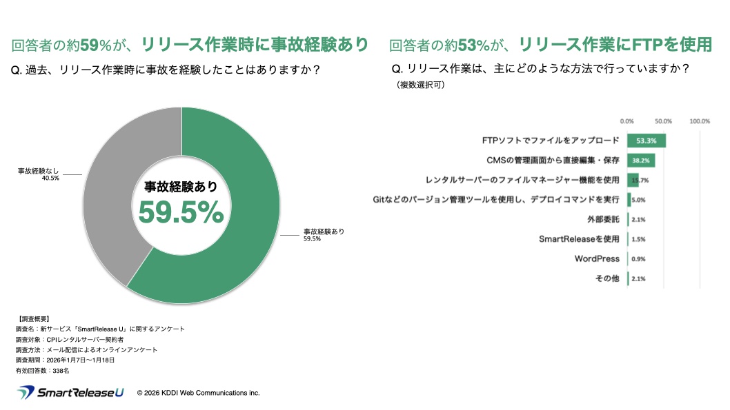 本調査では、リリース作業で事故経験がある回答者のうち、53.3%と半数以上が本番作業にFTPを利用しているという実態が明らかになりました。20年以上にわたり多くの現場で利用されているFTP中心の作業方法は、公開前にローカル環境へバックアップを取得するなどリリースに伴う作業負荷が大きく、運用効率の面で課題とされています。また、FTPポートを開放することによるセキュリティリスクも指摘されています。