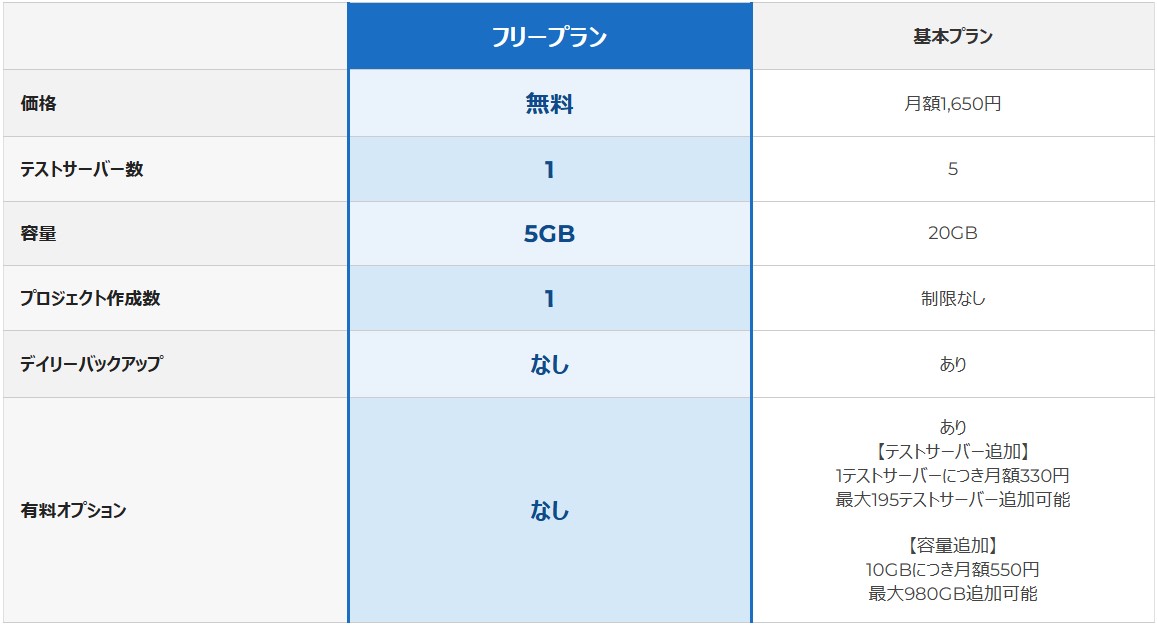 - ※フリープランでは、テストサーバー数・サーバー容量の追加はできません。追加する場合は、基本プランにアップグレードする必要があります。