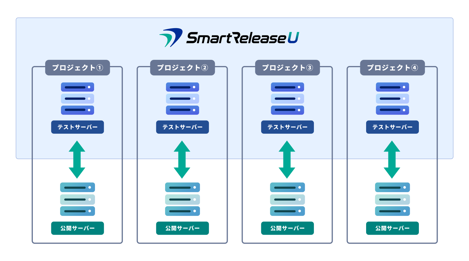 当社が提供しているCPIのレンタルサーバーに限らず、各社サーバーとの接続が可能。公開サーバーと接続し、データをテストサーバー(SmartRelease U)に転送コピーしてすぐに開発が開始できるため、運用中の案件にも労力をかけず導入ができます。